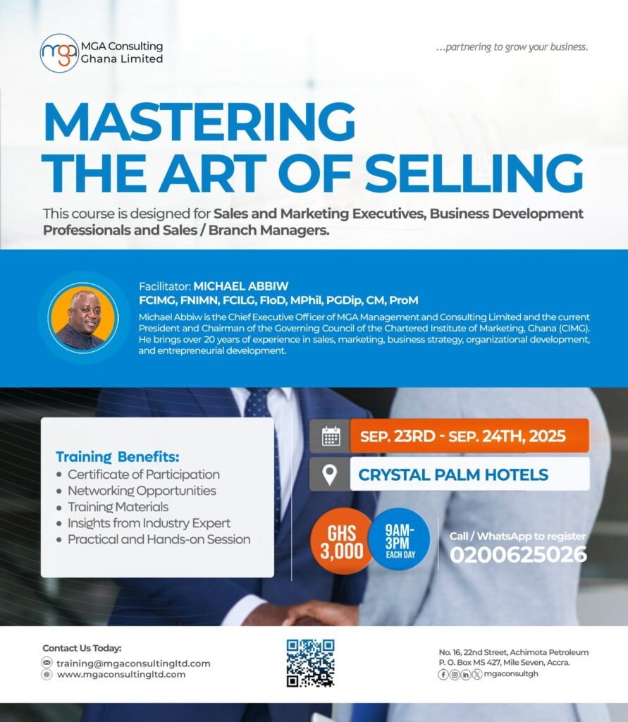 Mr Michael Abbiw. Michael is certified trainer, a mentor, and a Fellow of National Institute of Marketing Nigeria (FNIMN) and Chartered Institute of Marketing Ghana (FCIMG). He is also a full member of the Chartered Institute of Marketing (MCIM) – UK with over eighteen (18) years of Leadership and Sales and Marketing Experience. Before joining MGA Consulting, he held various senior management roles in various finance organizations.
